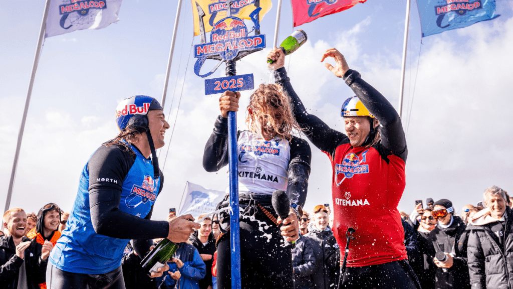 Ветер силой 8 баллов, трёхметровые волны и прыжки выше 20 метров. 15 сентября Нордвейк превратился в арену стихии — Лоренцо Казати и Зара Хогенраад стали чемпионами Red Bull Megaloop 2025.